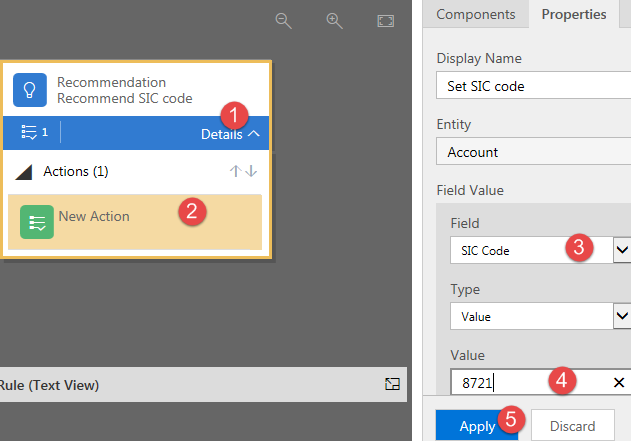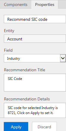 A new action Recommendation is also added, which is very useful to provide suggestions and avoid the data entry errors. Let’s take an example of creating an account record, where we want to inform the user about the correct SIC code, which is based on the industry selected by the user. Let’s use the steps, mentioned below to use the recommended action.