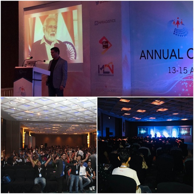 As the sun moved up in the sky, the crowd started arriving; at 10:00 in the morning, the hall of the Day 2 Keynote Session was packed with techies. The Keynote session started with a warm welcome from our founder Mahesh Chand where he welcomed and thanked everybody. The Keynote hall was jam-packed with technology enthusiasts, C# Corner MVPs, our honorable speakers, and the C# Corner Team. Mahesh started his presentation with a motivational video clip of current Indian Prime Minister, Mr. Narendra Modi.