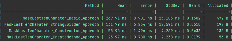 We can see that it takes 283.5 NS and is allocated 472 bytes. You may think it's very less, yes it is but it is just a scenario and only one operation. In real-time product we have to do string manipulation many places and that may be include much more complex logic.