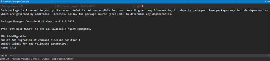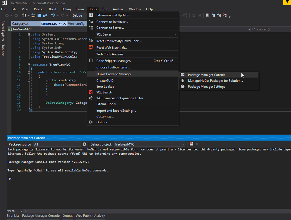 Figure 9 Opening Nuget package manager consoleNow, let's enable migrations for our Project using