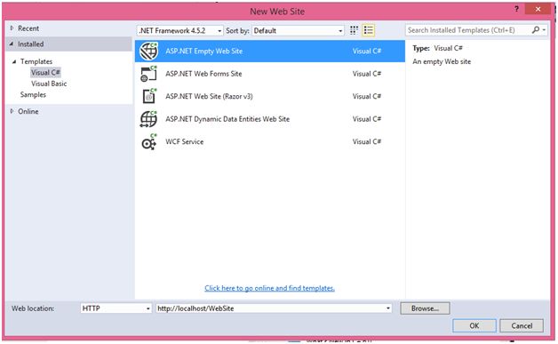- Chose an “ASP.NET Empty Web Site” and give a solution name so for example I took an example “CalendarExample”.