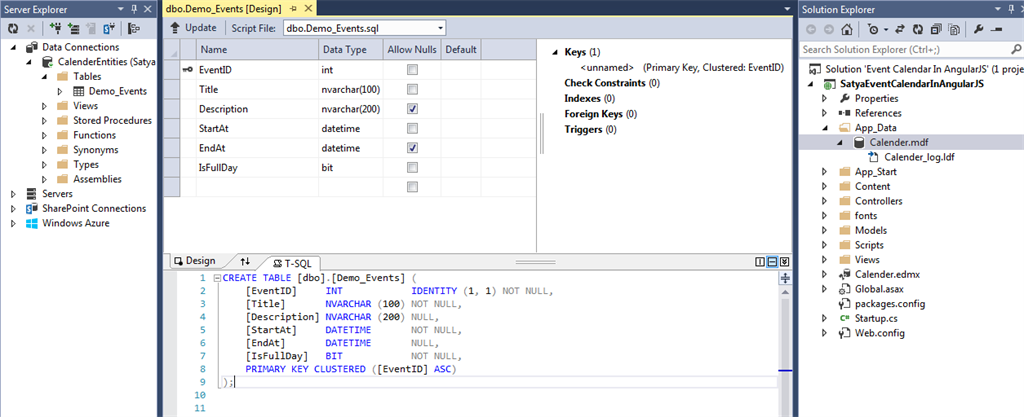 Create a database named "Calender" in the App_Data folder. Inside this database, create a new table named "Demo_Events".