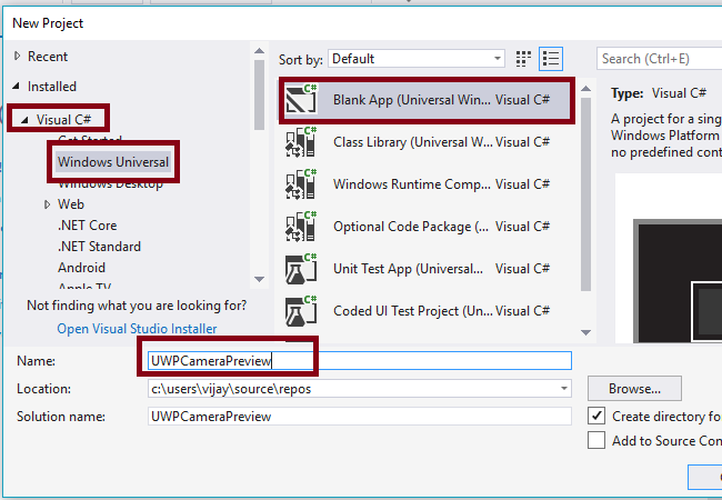 Open Visual Studio 2017 -> Start -> New Project-> Select Windows Universal (under Visual C#)-> Blank App(Universal Windows) -> Give the suitable name for your app (UWPCameraPreview)->OK.