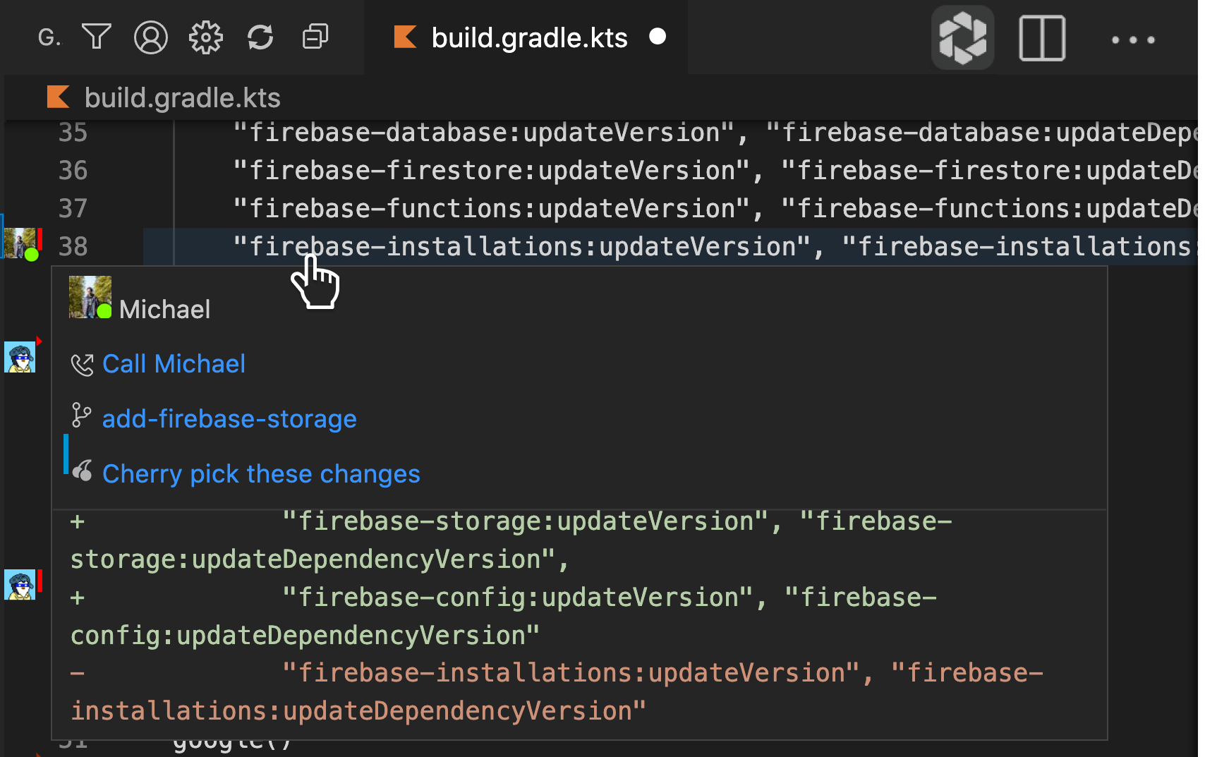 When you open a file you’ll see the change indicators in the gutter of your editor that shows you where your teammates have made changes compared to your version of the file. These update in real-time as you and your teammates are editing.