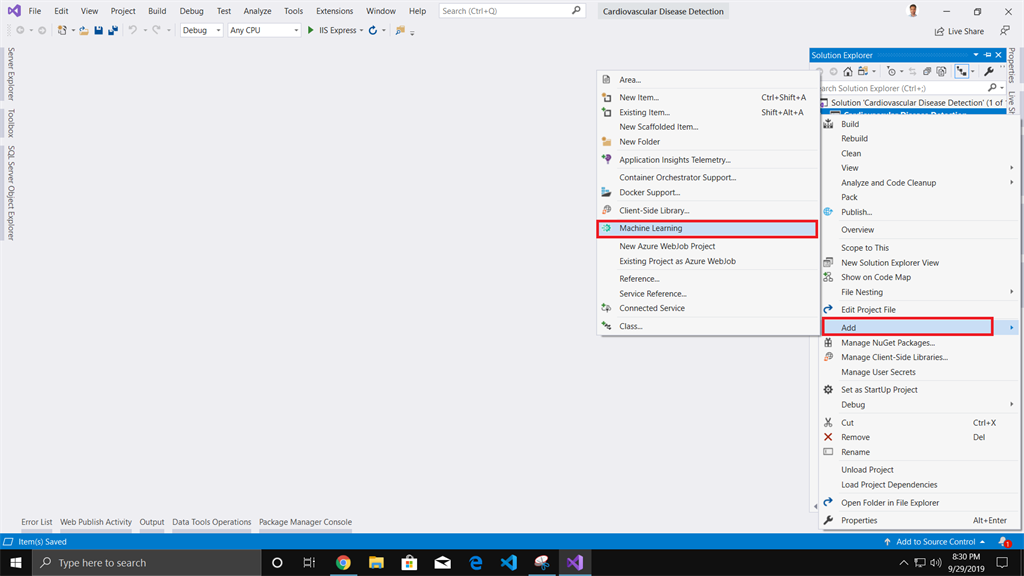- Right-Click on the project and Select Add>Machine Learning.