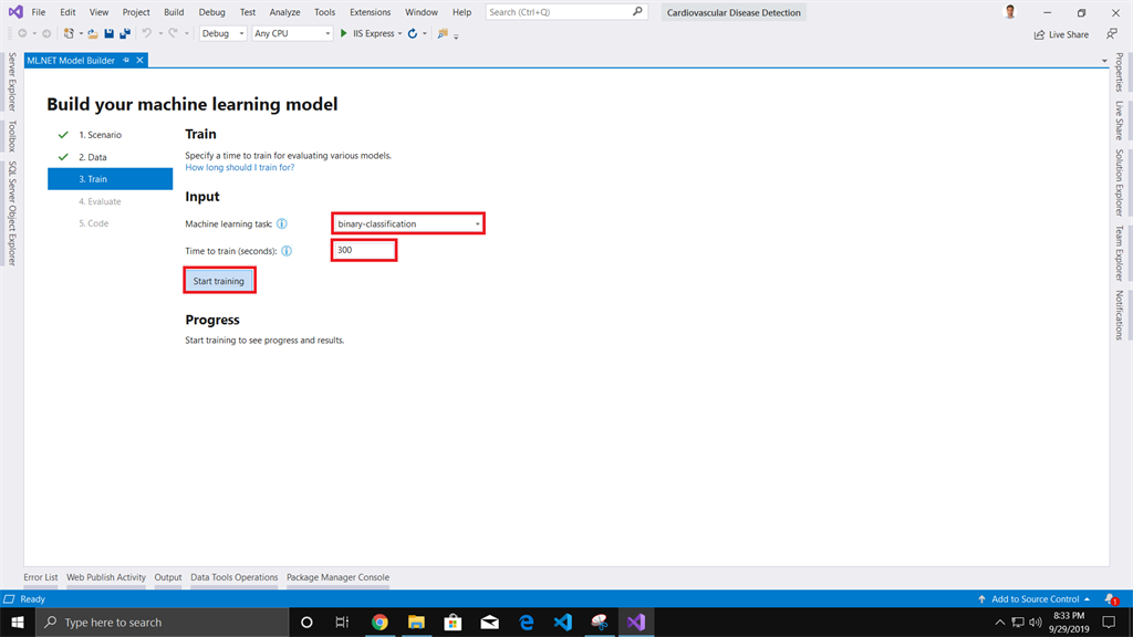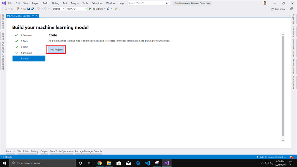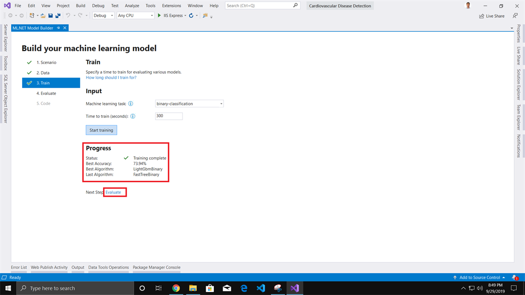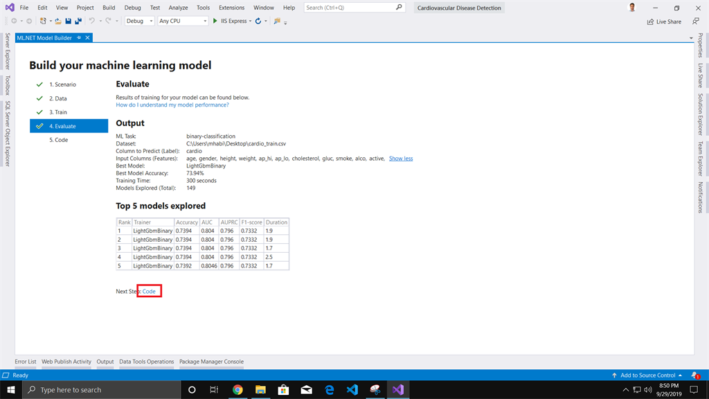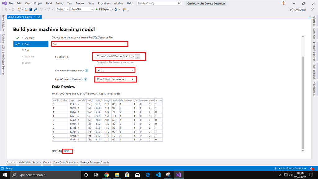 In this article, we have used ML.NET Model builder to build our Cardiovascular Disease Detection machine learning model.