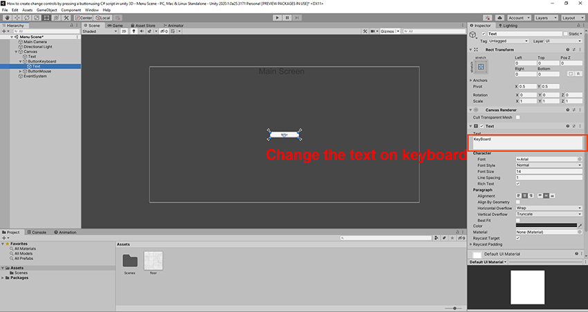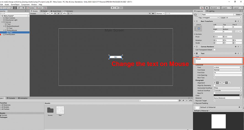 Select the button mouse text, we'll call the script on the canvas and Click mouse button.