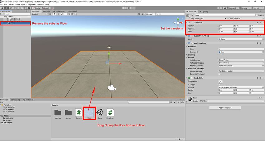 Rename the cube as floor and set the transform. and let's drag and drop floor texture on a cube