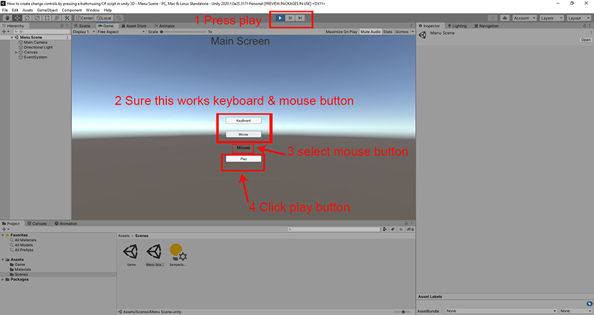 Start the game scene, go to the menu screen. Press the play button. Let's make sure the mouse and keyboard button works, by clicking the button.