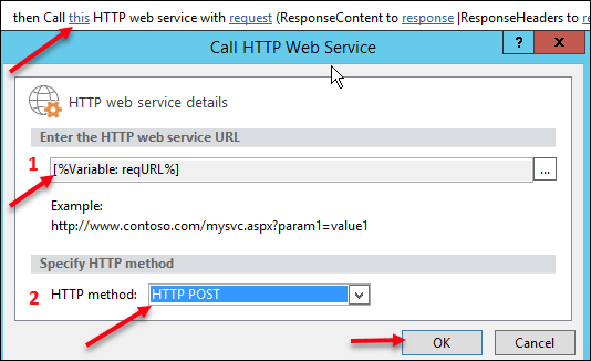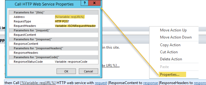 - Here, set variable ‘JSONRequestHeader‘ as RequestHeaders property which we have already created (In Part 1) as shown in the image above and click OK button.