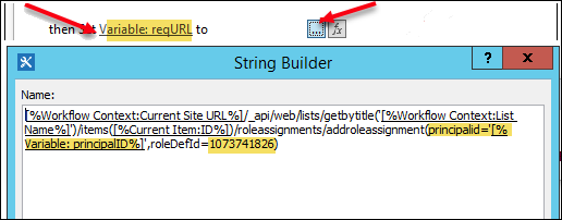 - [%Workflow Context:Current Site URL%]/_api/web/lists/getbytitle('[%Worklfow Context:List Name%]')/items([%CurrentItem:ID%])/roleassignments/addroleassignment(principalid='<Principal ID>',roleDefId=<Role Definition ID>)