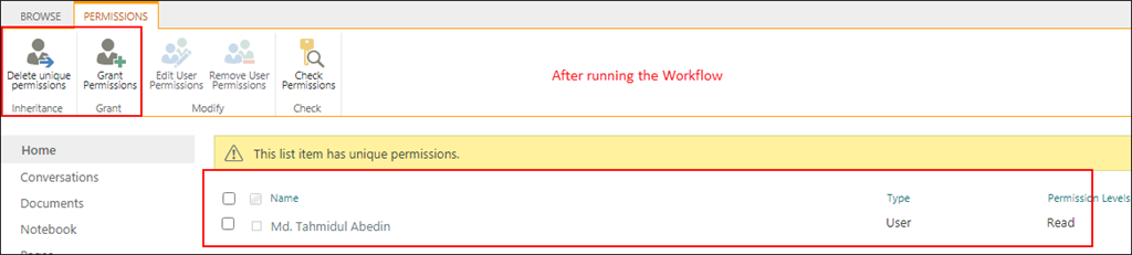 - Here we can see that after running the workflow, we have the control to delete unique permissions and grant permission for this particular item as shown in the above image (Fig 7).