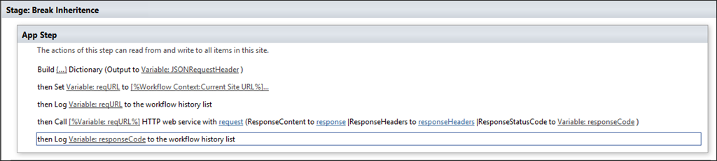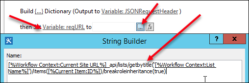 - [%Workflow Context:Current Site URL%]/_api/lists/getbytitle('[%Worklfow Context:List Name%]')/items([%CurrentItem:ID%])/breakroleinheritance(true)