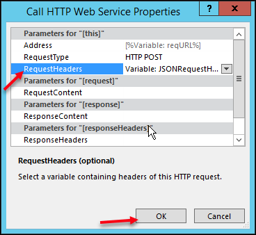 - Here, set variable ‘JSONRequestHeader‘as RequestHeaders property which we created in the above steps as shown in the image above and click OK button.