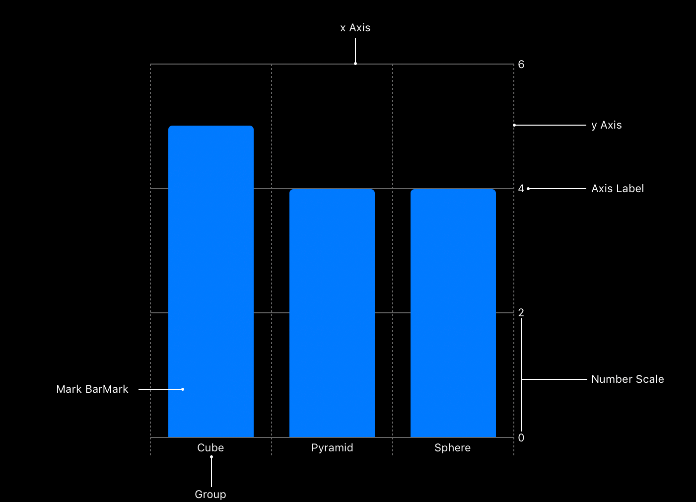 Here we have created an empty Chart container. In the Chart container, we will specify our data. We can specify marks using BarMark, LineMark, or PointMark. We use LineMarks to visualize the data with lines of a chart, and PointMark to show the points on a chart, called a Scatter plot. We will use the BarMark here, which shows the bar on the chart.
