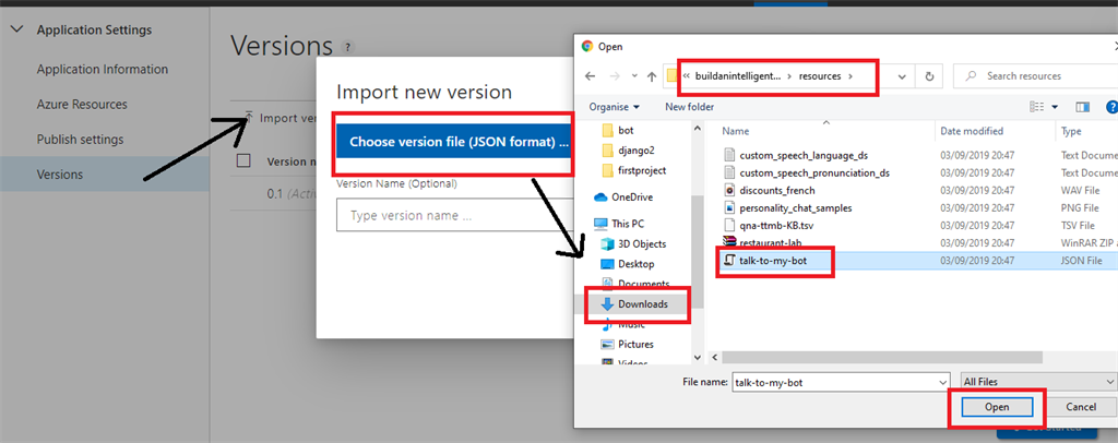 Click on Choose Version File. Select From \Downloads\buildanintelligentbot\resources\talk-to-my-bot.json file. Then click on Done.