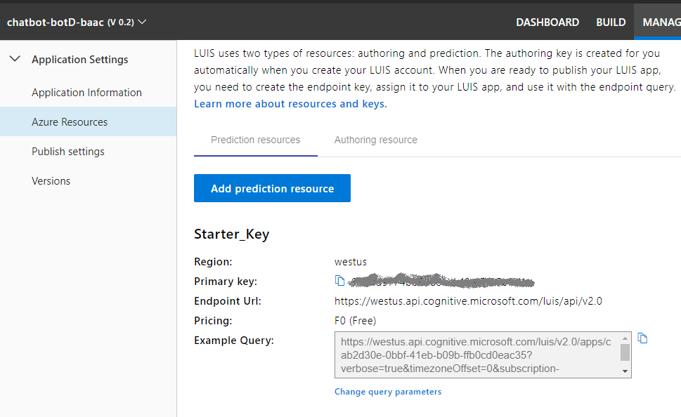 Click on the Manage Option. Go to Azure Resources and copy the authoring key to Notepad. We will need it later on.