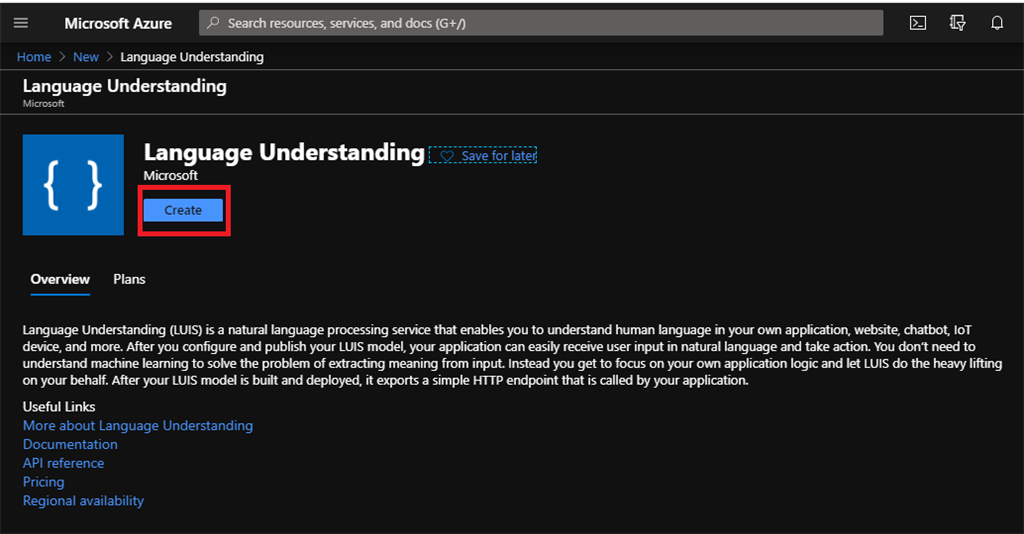 Open Azure Portal -> Create new resource -> type Language Understanding Select the first option and choose Create.