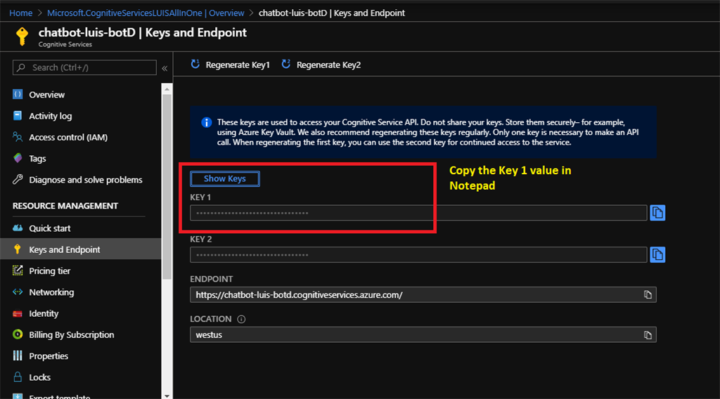 Select this resource and go to Keys and Endpoint page. Copy the Key 1 value to Notepad. We will use it later on.
