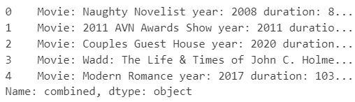 df['combined'] = 'Movie: ' + df['name'] + ' ' + 'year: ' + df['year'].astype(str) + ' ' + 'duration: ' + df['duration'] + ' ' + 'certificate: ' + df['certificate']