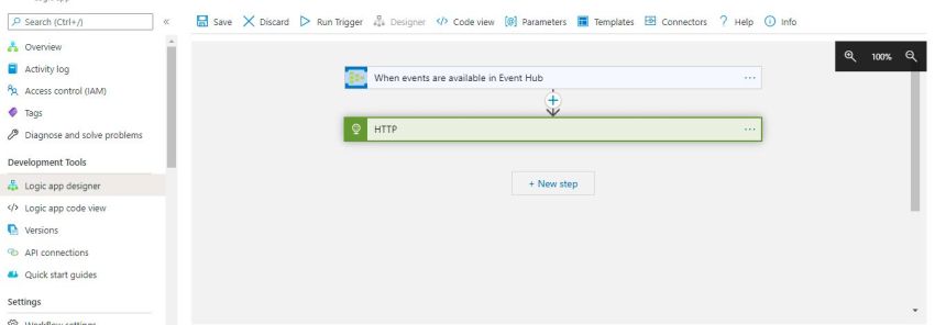 You can see in the logic app designer I have added one trigger and one action. You can use HTTP Trigger or event grid trigger but I already had an event hub employed for this so I used event hub trigger.