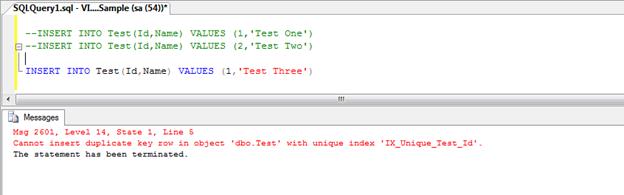 After creating unique cluster index, we cannot insert duplicate values in table which field created unique index. First, we insert two records into “Test” table. Then, when we again insert the same Id into table, we get the error as in the below screenshot.