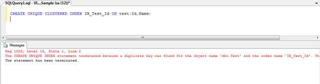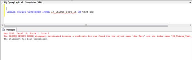 Note - We can create Unique cluster index after inserting records. If we have duplicate records in table, we get an error while creating unique index cluster index, like the below screenshot.