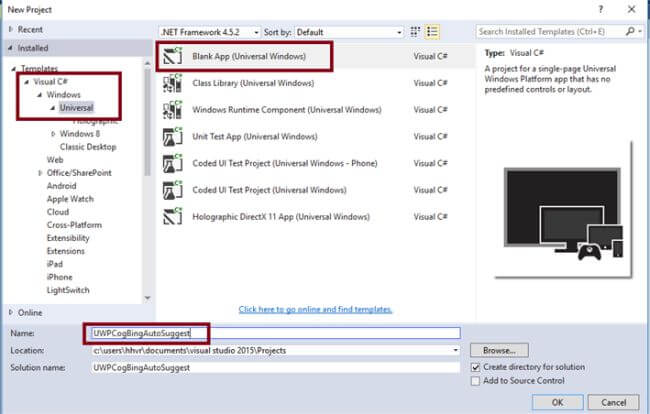 Open Visual studio 2015 -> Start -> New Project-> Select Universal (under Visual C#->Windows)-> Blank App -> Give the Suitable Name for your App (UWPCogBingAutoSuggest)->OK.