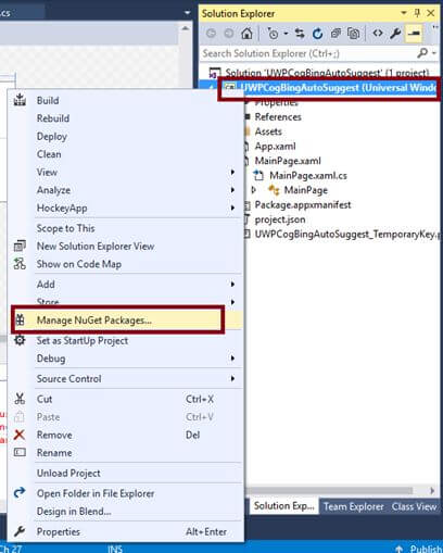 RightClick Your Project (UWPCogBingAutoSuggest) and Select Manage Nuget Packages.