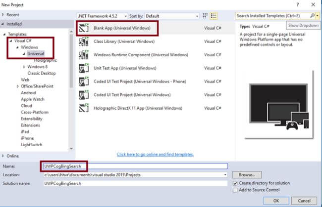 Open Visual studio 2015 -> Start -> New Project -> Select Universal (under Visual C# ->Windows)-> Blank App -> Give a suitable name for your app (UWPCogBingSearch) -> OK.