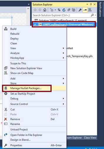 Open (double click) the file MainPage.xaml in the Solution Explorer and add the Newtonsoft.Json reference in the project. Right click your project (UWPCogBingSearch) and select "Manage NuGet Packages".