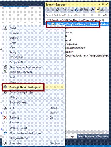 Open (double click) the file MainPage.xaml in Solution Explorer and add the Newtonsoft.Json reference in the project. Right click on your Project (UWPCogBingSpellCheck) and select Manage NuGet Packages.