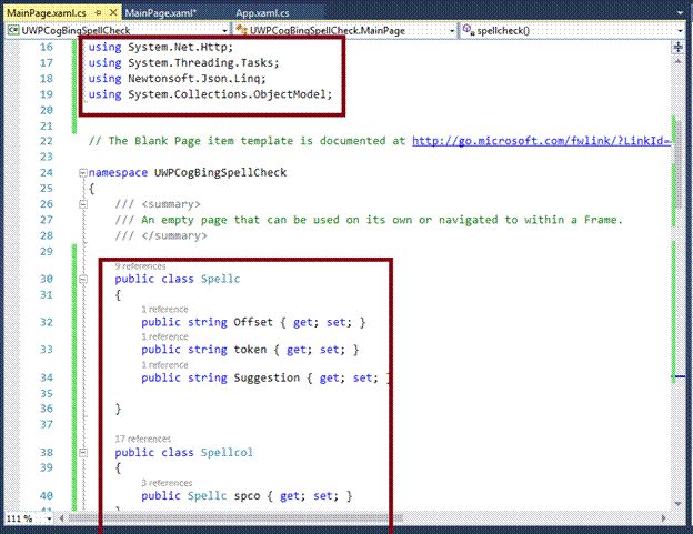 Add the namespaces, mentioned below in Mainpage.xaml.cs for Bing Spell Check.