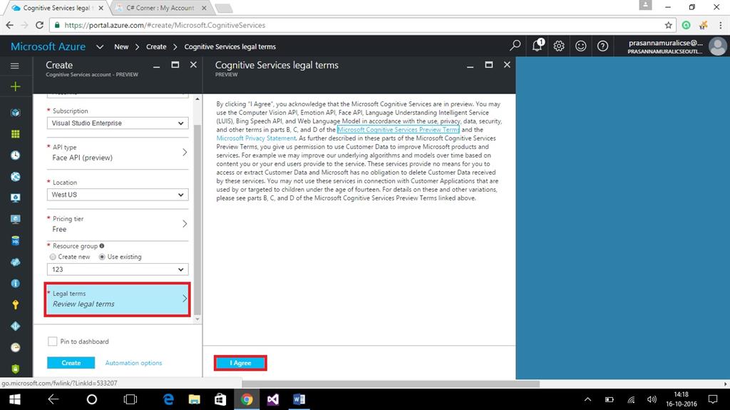 Login into Azure Management Portal to create Cognitive Service account for Face API.