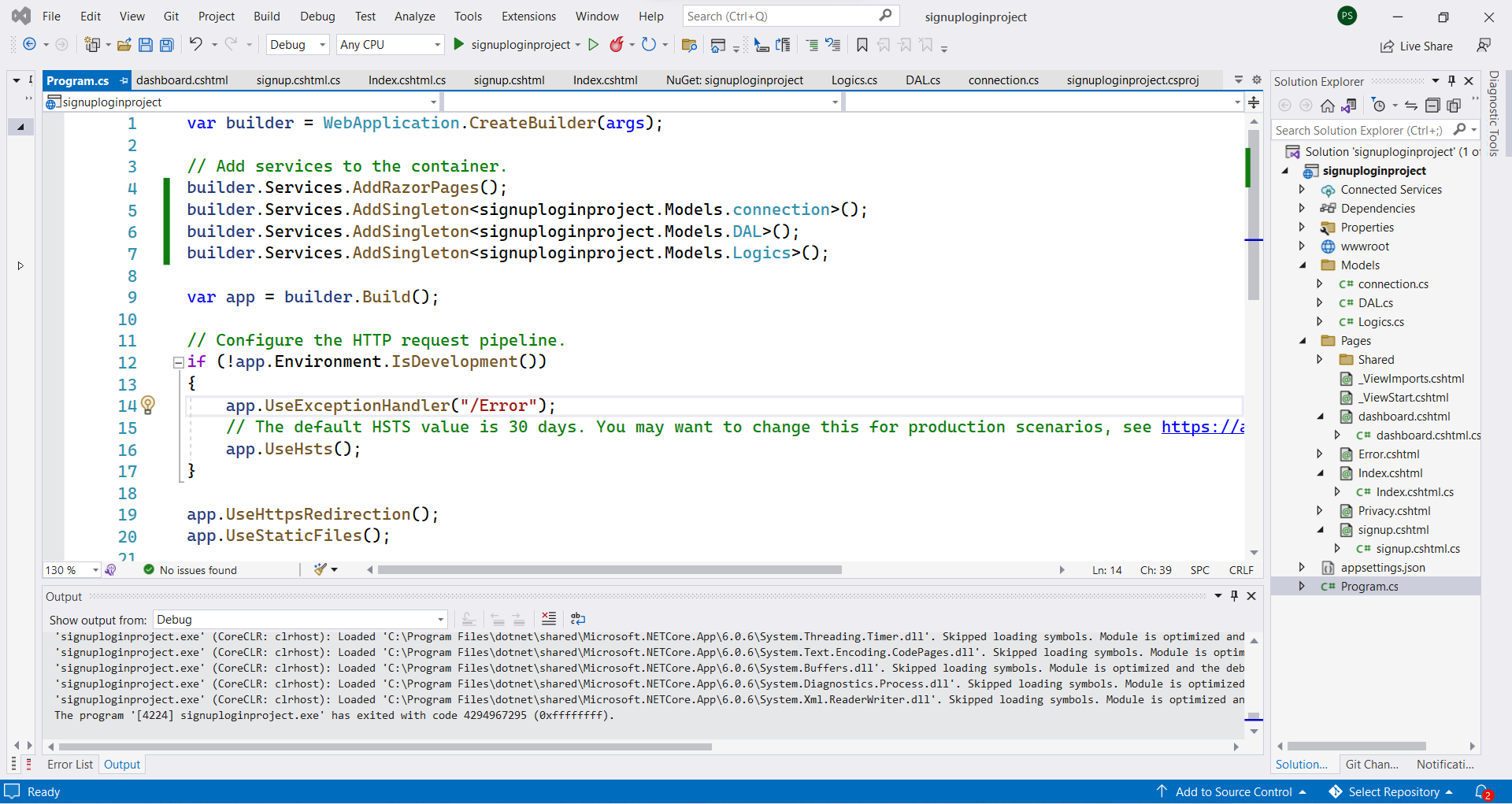 Write a code on the Index model page. In the index model page constructor, we pass the Logics class with the object for injecting dependency, then creates the IActionResult OnPost function, and pass the email and password as a parameter. In the IActionResult OnPost function, call the Login function from Logic Class and all results will be stored in the res bool type variable then we check whether the result is true or not. If it is true redirect the dashboard page otherwise it returns the error page. The error page is already available on solution explorer.