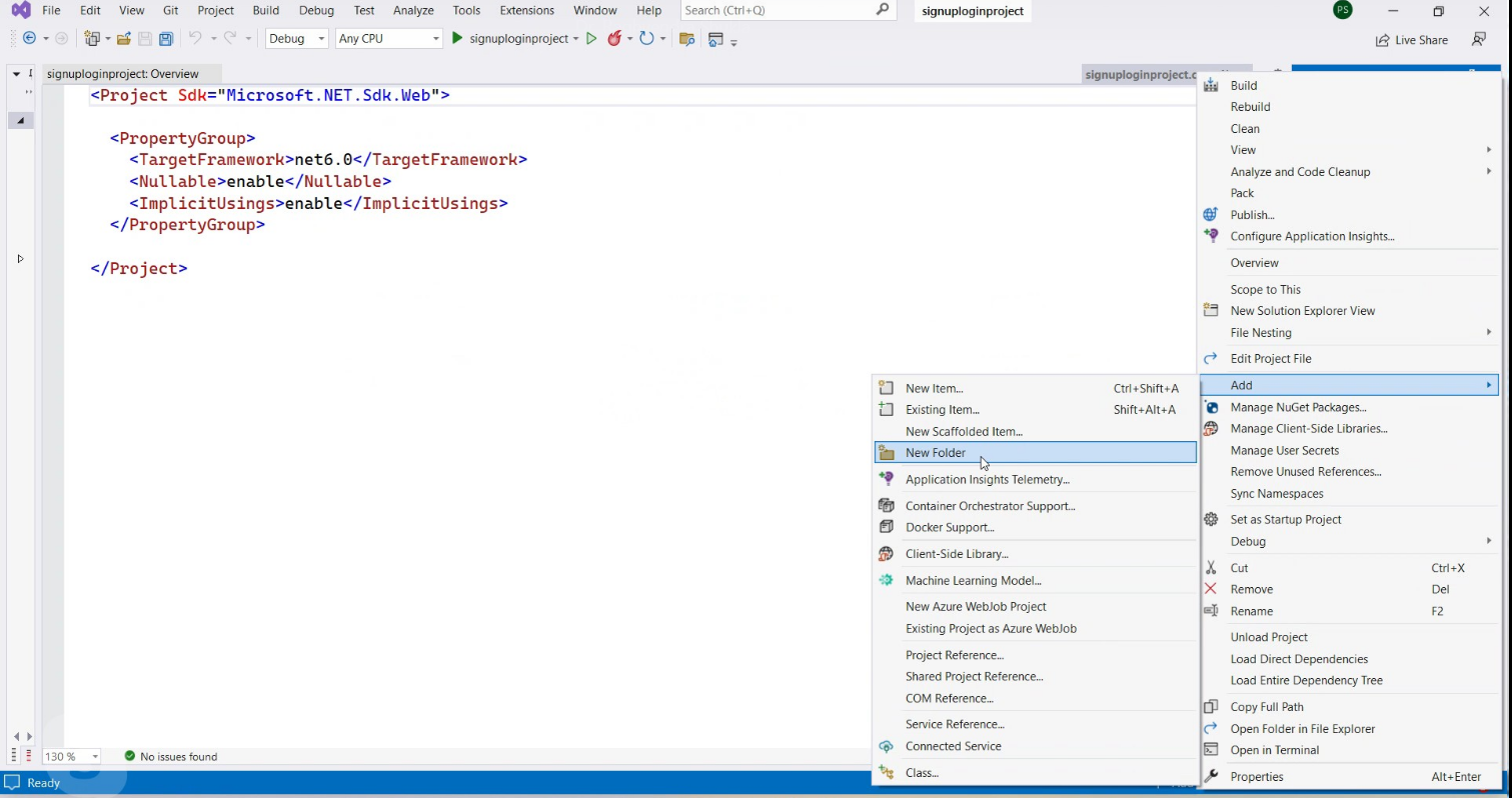 Here create a new folder on solution explorer. Right-click on the project name in solution explorer and select Add option then select the new folder option then write the name of the folder.