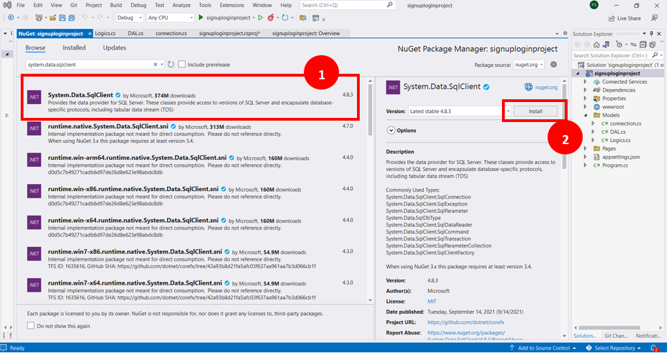 To install the System.Data.SqlClient package from NuGet Package Manager. To right-click on the dependencies folder on solution explorer and choose the NuGet Package Manager. In a NuGet click Browse and search to System.Data.SqlClient and click to Install.