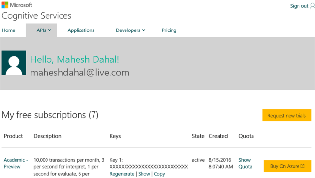 Once you click Create, just wait for a few minutes and your Cognitive service will be ready to serve your application. After the service is ready, you have to go to https://www.microsoft.com/cognitive-services and click on My Account.