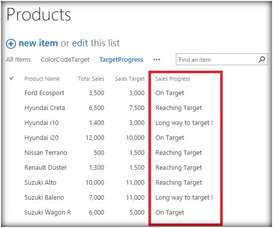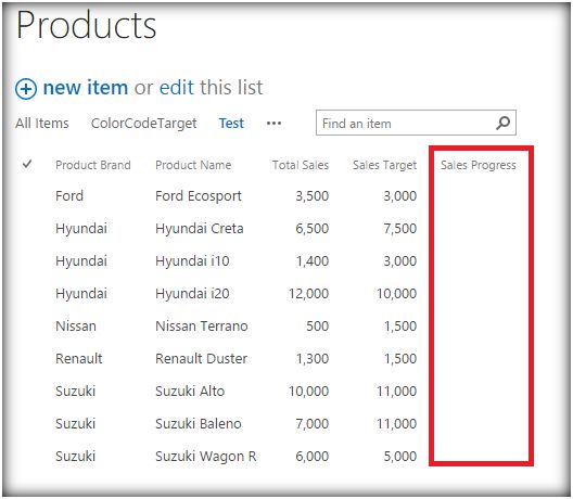 Thus we have populated the Sales Progress column during run time. It was initially empty and on run time it has generated values dynamically by comparing two other column values. CSR is highly useful in tapping into the rendering process of list view. We will cover more of CSR practical uses in the upcoming articles.