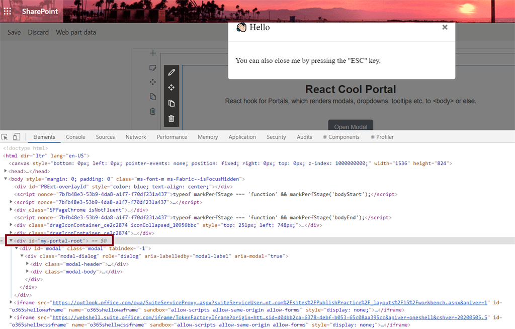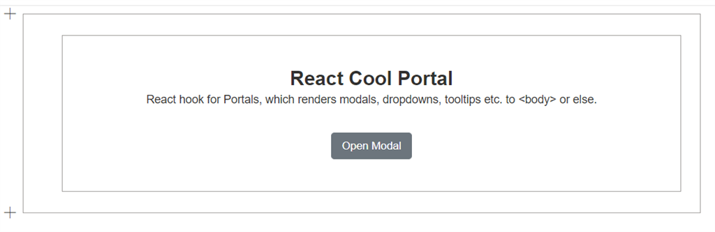 The above code will not bind on the root element of the component. Instead it will create a new id at the end of root component and bind there. If we fail to mention containerid, it will generate default containerid with the name react-cool-portal.