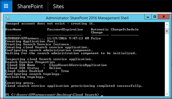 Finally, we will get the success message, which indicates that the Cloud search Service Application has been created.