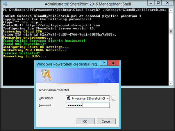 In order to complete the Cloud hybrid search set up, we have to connect the recently created Cloud search Service Application to the Office 365 tenant. Microsoft has provided the script to automate the onboarding of the Cloud search Service Application and Office 365 to Cloud hybrid search. You can get the script named Onboard-CloudHybridSearch.ps1 here.
