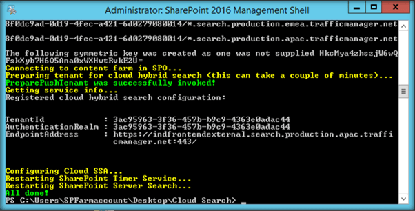 In order to complete the onboarding of Cloud search Service Application and Office 365 on to Cloud hybrid search, let’s go ahead and run the Onbaord-CloudHybridSearch.ps1 script.