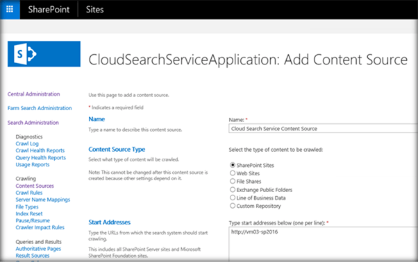 As a final step in configuring the Cloud hybrid search, we have to create a content source and run a full crawl in SharePoint 2016 On Premise Server. Clicking on the Cloud Search Service Application will open up the Search Administration page. Select content source in the left pane of the search administration page.