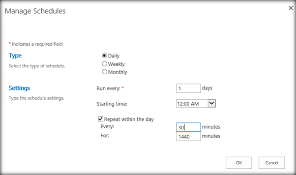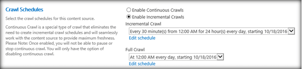 We can also specify the crawl schedules. We can set the schedules when the incremental and full crawls will take place in the Server.