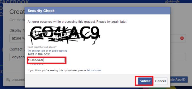 Enter the captcha for the security check and click "Submit". Now, you will be redirected to the Facebook developer dashboard.