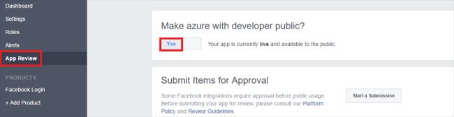 Click "Next" for setting up the Facebook SDK and click Next again in access tokens and permissions needs window. After that, the account is registered as administrator. For authentication, click "App Review" in teh left pane and enable the public aunthentication.