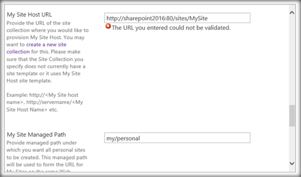 As we move down, we have the option to enter My Site Host URL. Enter the site URL, which was earlier created to act as My Site. We also have to specify the managed path under which My Sites will be created. Here, I have added the managed path “sites/MySite/Personal”.
