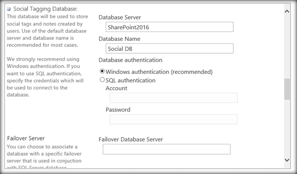 Specify the database Server and the database name, which will be used to store the social tag and notes.