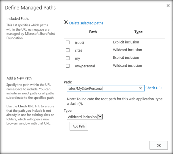 Specify the managed path name as “sites/MySite/Personal” and click OK.